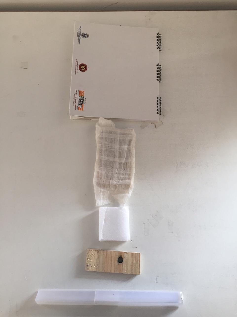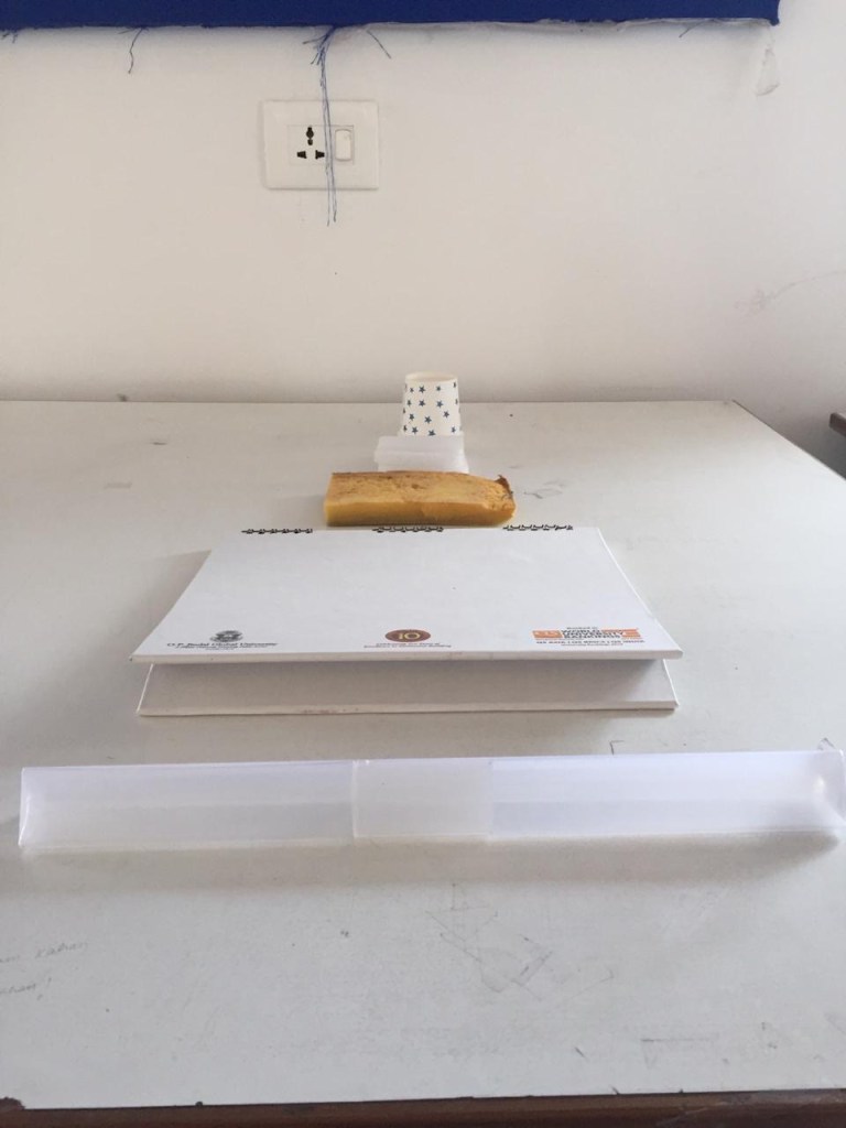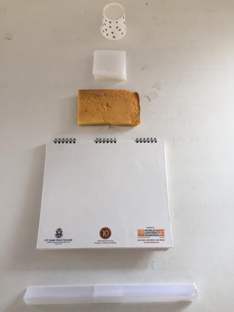 What I learnt is reflected in the class exercise ( time problem) that I did to make portals with scrap and with some specified constraints told by the professors. We were all given a cardboard sheet to use as a base or plot to work on. I had brought some materials like squared foam sheets, thumb pins, paper cups and much more.