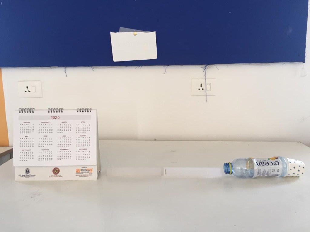 Above is the representation of my room, it is a small squared room with two cupboards embedded in the wall, a huge shelf and a double bed with attached washroom. This room too has windows in south direction but doesn’t has any door facing the east. The place is not brightened up with light as the organised place yet it isn’t that dark too. The term dark here shows, how I perceive it as dark.